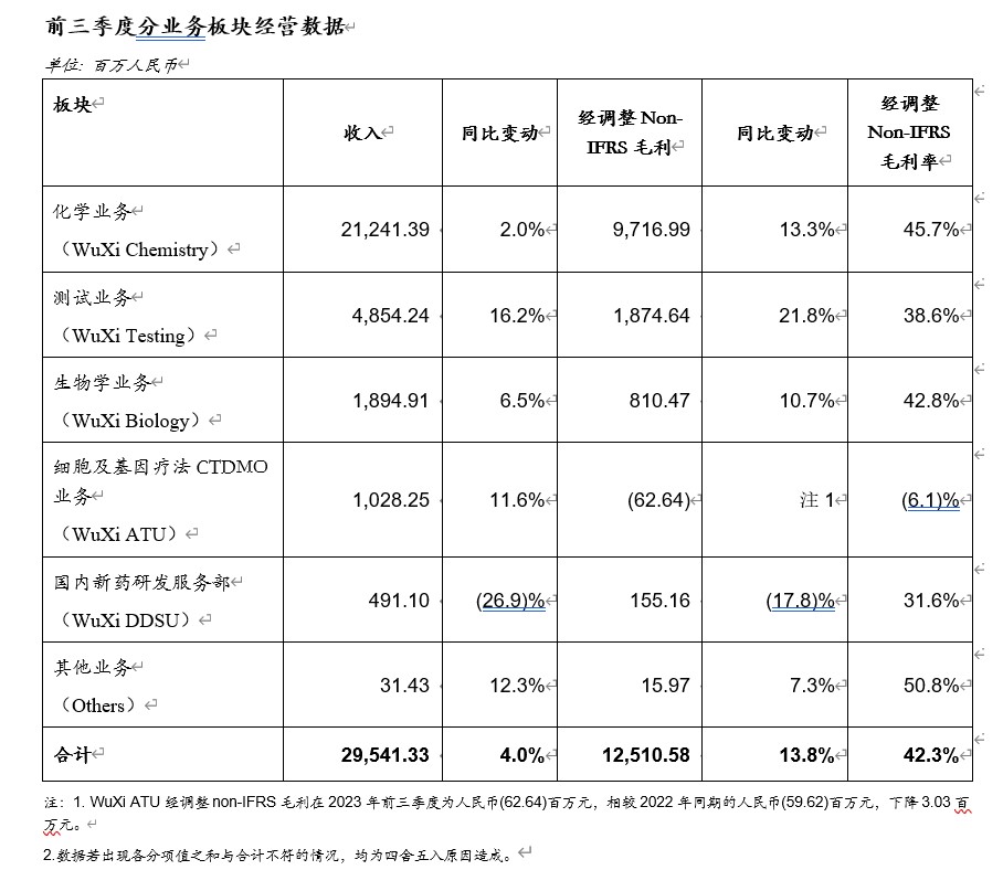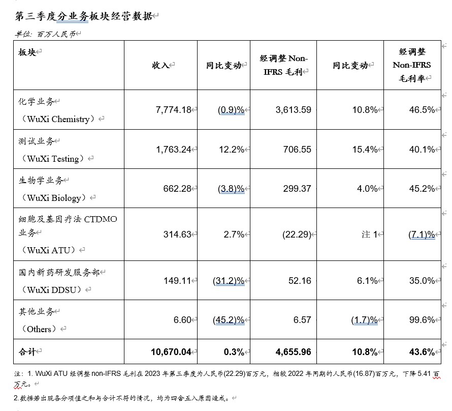 上海,2023年10月30日,为全球生物医药行业提供全方位、一体化新药研发和生产服务的能力和技术平台公司——无锡药明康德新药开发股份有限公司(股份代码:603259.SH / 2359.HK)发布2023年前三季度业绩报告: