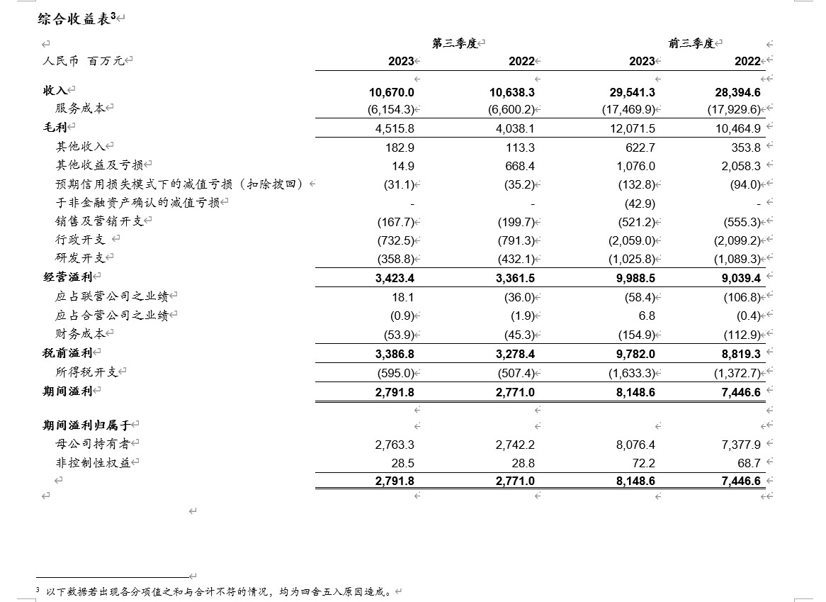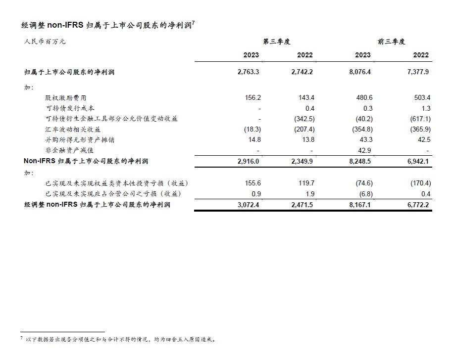§ 前三季度经调整Non-IFRS归母净利润81.67亿元,同比增长20.6%;经调整Non-IFRS稀释每股收益2.77[1]元,同比增长21.0%